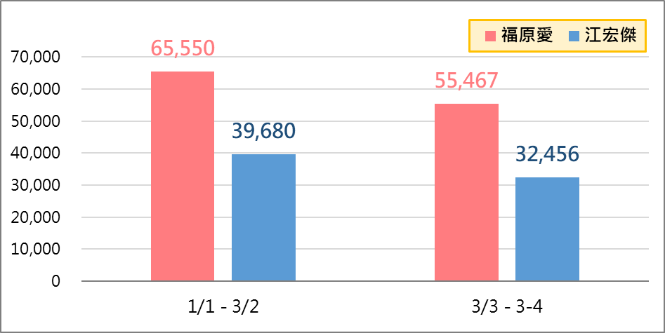 據(jù)《山水民調X輿情觀測》聲量趨勢資料可知,3/3福原愛與「橫濱大谷翔平」同遊照片曝光後,網(wǎng)路上相關討論熱烈至極,兩天內(nèi)提及「福原愛」的討論聲量共55,467則、「江宏傑」的討論聲量亦有32,456則,其火紅程度更勝上個月趙少康鬆口參選下屆總統(tǒng)(2/8,35,328則討論),可見金童玉女的婚姻崩壞,十分受到吃瓜群眾注意。
