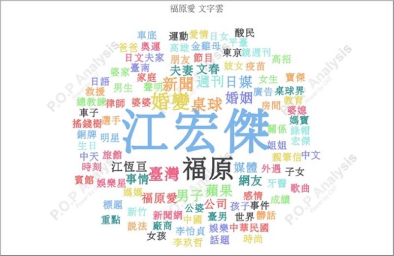 據(jù)《山水民調X輿情觀測》文字雲(yún)資料可知,在3/3-3/4期間,以福原愛為主題進而檢視相關討論,發(fā)現(xiàn)有參雜著不少「婆媳」、「婆婆」、「夫家」、「江恆亙」等關鍵字,不難聯(lián)想到外界易將婚變原因,與婆媳關係進行串連,尤其日媒把江宏傑的大姊江恆亙封為「妖怪大姑」,並爆發(fā)粗口辱罵福原愛一事後,相關討論在網(wǎng)路上變本加厲。